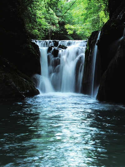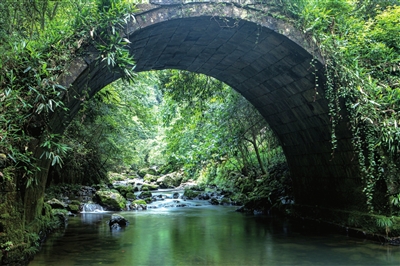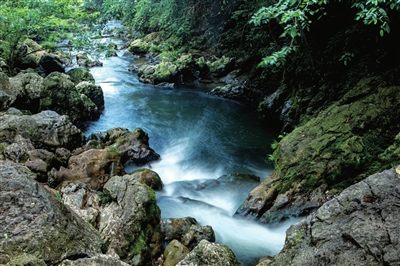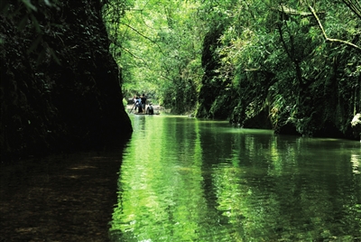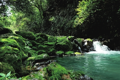 沿溪流而下,进入一条大峡谷。两岸青藤古蔓密布,竹木青翠参天,谷中之水色彩斑斓、清澈透明。沿途溶洞、古桥、瀑布、山泉、水潭、巨石、水草、沙滩交替。崖壁上,古人开凿的水渠、小路仍依稀可见……