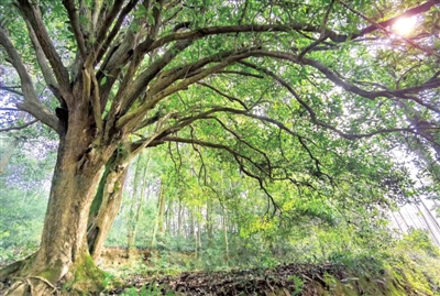 下山的时候经过一个老砖窑,距窑两米处有一棵600岁的古桂王,劲拔的躯干直逼苍穹,如云的绿叶赏心悦目。这棵神奇的古桂不仅历经了600年风雨侵蚀,而且经受住高温炙烤,死而复生,重新焕发出生机活力。据老童讲,以前烧过几年窑,相距仅两米的古桂差点被烤死,树叶差不多掉光,村民称之“鬼剃头”,都以为它将死去。想不到,几度春风吹过,它又奇迹般活过来了,逐渐长出新叶,变得郁郁葱葱,欣欣向荣。