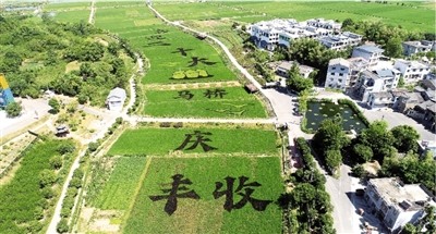 8月9日,航拍下的咸安区马桥镇曾铺村建国畈,用彩色水稻种植出的“喜迎二十大庆丰收”等图案字样分外醒目。