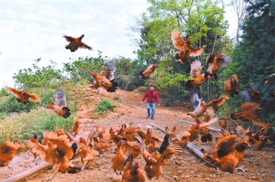 在八燕村郑普雄的养鸡合作社,一群群散养土鸡在树林里觅食,一头头放养的两头乌生猪在山坡上奔跑。