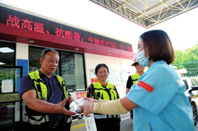 “谢谢你们送的水,特别解渴……”16日,烈日当空,在市区银桂加油站,环卫工人吴女士收到中石油咸宁销售分公司赠送的饮用水。
