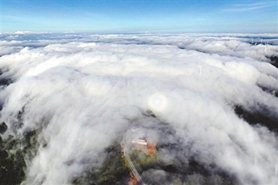 近日,在湖北省五峰土家族自治县独岭山顶现奇特的“佛光云海”美景。山谷中升起浓浓的白雾,覆盖了整个山体,在银白色的大雾中,“佛光”时隐时现,并随着浓雾的移动而移动,美妙无比。“佛光”其实是一种“日晕”,当阳光照在云雾表面,经过衍射和漫反射作用形成“佛光”的自然奇观。