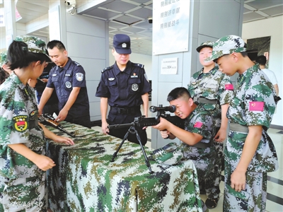 授旗仪式结束后,警营开放日开启,同学们在民警的带领下参观了特巡警支队营房,民警向队员现场讲解并演示了95式自动步枪、盾牌、钢叉等武器装备的功能和作用。