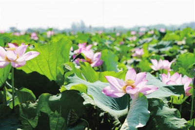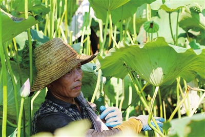 放眼望去,成片的荷花田里,荷花形态不一,有的含苞待放,有的全面盛开,有的莲蓬已成熟。微风拂过,莲叶翻滚,泛起层层绿浪,村民们身穿长袖长裤,头戴草帽,脚穿胶鞋,忙碌地采摘着颗粒饱满的莲蓬,辛勤的汗水见证着丰收的喜悦。