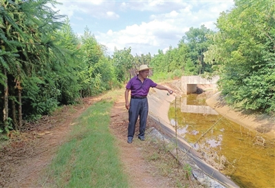他带着村干部刘力,一手拿着矿泉水瓶,一手不时地擦拭额头上的汗水,凭着多年的经验,循着前期清障的痕迹一路走、一路看,察看其中的涵闸是否漏水,关注其中的流量是否减少。