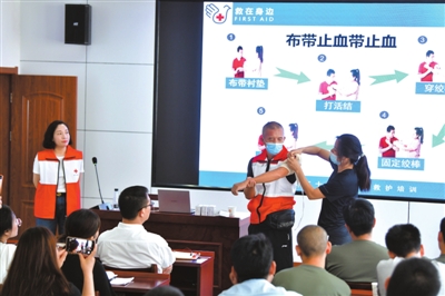 9日,市退役军人事务局会议室,机关干部职工在市红十字会工作人员的指导下学习应急救护操作要领。