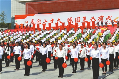 10月10日,咸安文体中心广场,来自该区的学生、区直单位干部职工以及乡镇办场代表近千人,一起合唱《前进吧,中国共产党》。