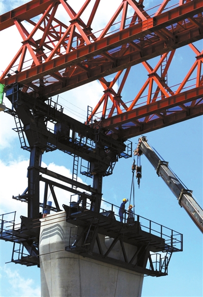 为了提升工效,项目在施工中使用了国内少见的“塔梁异步”施工法,先建塔、再建梁,效率高,但在没有下横梁支撑的情况下,两侧38米高的下塔柱将向外倾斜,产生强大的拉力,容易导致下塔柱根部出现裂缝,对主塔安全造成隐患。为了解决这一难题,指挥部创新工艺工法,采取利用下横梁预应力钢束和钢管相结合的拉压体系工艺,稳定了整个结构,不仅确保施工安全进行,还节省了45天工期。