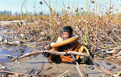10月20日,嘉鱼县新街镇嘉野生态农业有限公司基地,来自山东的挖藕工正在藕塘里采收野藕。