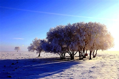 近日,位于内蒙古大兴安岭腹地的边境小城额尔古纳市出现美丽的雾凇景观。在额尔古纳湿地河谷地带,受低压空气影响,暖湿气流生成的雾气在湿地的乔灌草木上凝结成了冰晶。