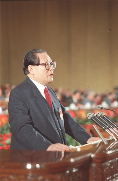 | 左图:1992年10月12日,中国共产党第十四次全国代表大会在北京人民大会堂开幕。这是江泽民同志代表第十三届中央委员会作报告。 |