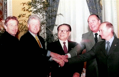 | 左图:2000年9月7日,由中国倡议的联合国安理会五个常任理事国首脑会议在纽约举行。江泽民同志(中)同法国总统希拉克(右二)、俄罗斯总统普京(右一)、英国首相布莱尔(左一)、美国总统克林顿(左二)握手合影。 |