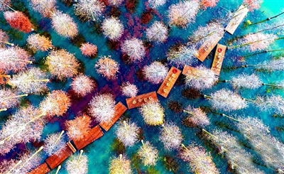 近日,江苏省宿迁市泗洪县洪泽湖湿地景区临淮段水杉林色彩斑斓,与碧绿的湖水相映成趣,如梦似幻。