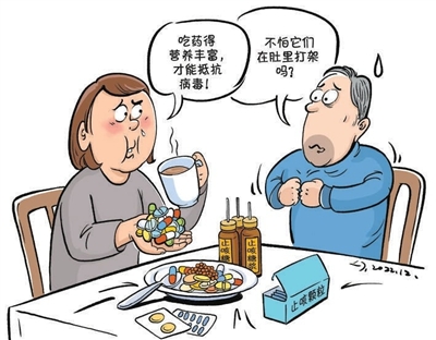 近日,河南一名女子在感染新冠后产生恐慌心理,不遵照医嘱盲目吃药退烧,被送进ICU抢救;深圳一市民发现自己出现发热、咽痛、咳嗽等症状,混合服用7种感冒止咳药,身上出现红斑和脓疱。无论是医生还是阳过的网友,都呼吁感染病毒之后,应该对症吃药。过度恐慌、过度用药,会给身体带来不必要的伤害。 李嘉/漫画