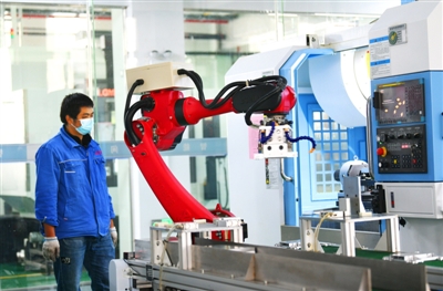 12月15日,咸安经济开发区凤凰科创园欧朗机械有限公司智能制造车间,工业机器人投入生产中,员工正在加班加点赶制订单。