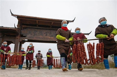 年关将至,近日,在海拔1000多米的重庆市万州区恒合土家族乡箱子村,村民们迎来一年中最忙碌的时节。掩映在大山深处的腌腊制品加工厂里,20多个村民正忙进忙出,拌料、灌肉、包装,相互配合间,一排排挂在风干架上的香肠、腊肉泛着光亮,香醇的腊味在风中飘散。