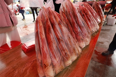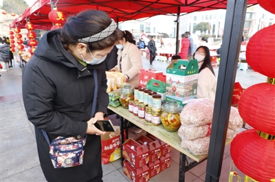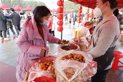 活动现场人头攒动,格外热闹,浓浓的年味扑面而来。几十个展台整齐排列,独具特色的黄精茶、黄精酒,家乡风味的各式腊货、脆爽多汁的马蹄、澄黄透亮的山茶油、酥脆可口的小麻花......种类丰富、质优价廉的农特产品,吸引了不少市民前来选购。参展商一边叫卖,一边将打包好的商品递给前来采购年货的市民。