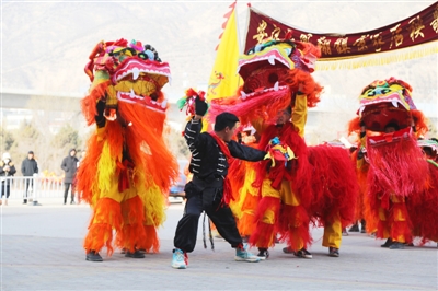 ①1月31日,甘肃省定西市安定区凤翔镇的社火队员在表演舞狮。