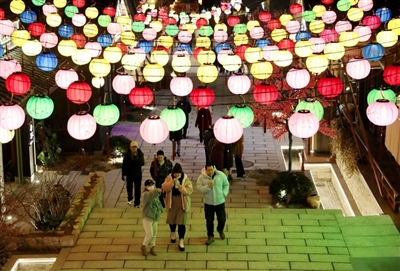 ④1月30日,游客在山东省青岛西海岸新区阿朵花屿景区观赏花灯。