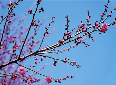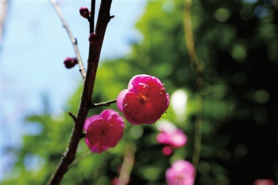 淡粉色的花瓣,再搭配上黄色的花蕊,处处传递着早春的气息。那一抹抹梅红,在阳光的映照下,灿若红霞,尤为绚丽。满是花蕾的枝丫间一朵、两朵、七八朵,灿然满树。小鸟、蜜蜂穿梭在花丛中,引来不少市民前往观赏、拍照、打卡,享受美好的暖春时光。