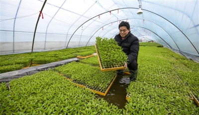 2月6日,嘉鱼富德蔬菜合作社里大棚漂盘育苗基地加温鼓风机轰鸣,农户们忙着育早春蔬菜苗。