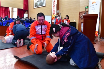 2月10日,咸宁香城学校学术报告厅,学生们正在市红十字会队员的指导下练习心肺复苏。
