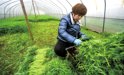 2月8日,嘉鱼县鱼岳镇陆码头村大棚藜蒿种植基地内,村民在抢收藜蒿,销往岳阳、赤壁等地。
