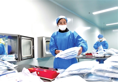2月9日,嘉鱼县经济开发区湖北卓亚医疗器械嘉鱼有限公司车间,工人们正在包装口罩。据了解,该公司总投资1.5亿元,主要生产手套、口罩、棉签等产品,目前部分生产线已建成投产,预计全部建成后产值可达1.5亿元,带动就业150余人。