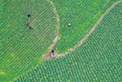 2月14日,在贵州省黔东南苗族侗族自治州岑巩县注溪镇周坪村,村民在油菜地里套种玉米(无人机照片)。