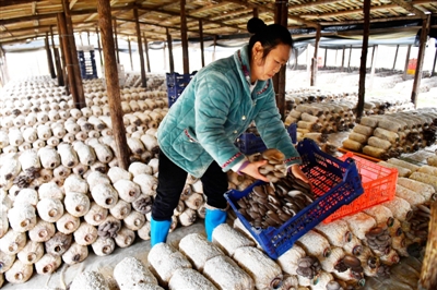 2月10日,咸安区马桥镇樊塘村好佳食用菌基地,当地农户正在采收蘑菇。