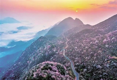 崇阳县龙泉山樱花谷有10万亩连片的野生樱花林,主要以华中樱为主。山上野樱花恣意绽放,如一个巨大的花冠,围绕在龙泉山周围,山下公路蜿蜒,山清水秀,风景怡人,游览其间,恍若穿行于画中。