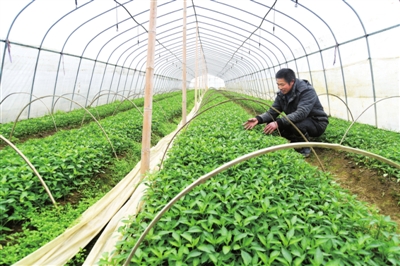 2月17日,崇阳县绿田蔬菜专业合作社集中连片蔬菜大棚内,蔬菜幼苗翠绿挺拔,菜农王光明正在察看菜苗长势。
