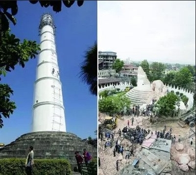 其中,180多岁的比姆森塔是尼泊尔主要地标之一,在地震中倒塌。这是以尼泊尔抗英民族英雄比姆·森·塔帕的名字命名的。比姆·森生前曾筑高塔两座,另一座已于1834年大地震时倒坍,此塔则经受了两次强烈地震考验。1934年大地震时,塔附近的房屋倒毁殆尽,而它却安然无恙,保存完好。不过,最终还是难以幸免。