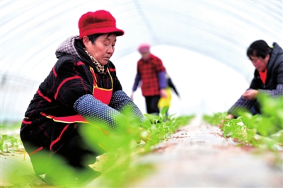 2月28日,赤壁市赤壁镇太平口村蔬菜种植专业合作社大棚,当地农户正在补栽菜苗。