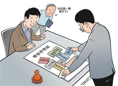 今年起北京市全面推广"一业一证"改革,让企业"只跑一次、只填一表、一次办成"。李嘉/漫画