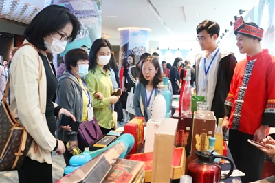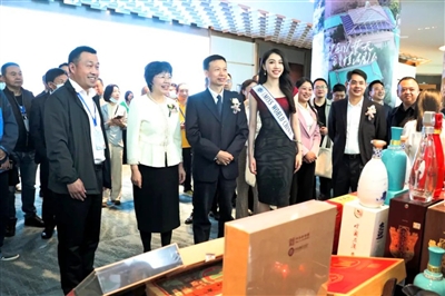 咸宁文旅展示区摆放了琳琅满目的特色文旅产品,丰饶独特的物产引得现场嘉宾纷纷侧目,对咸宁桂花产品、赤壁青砖茶、黄鹤楼酒、通城九井峰茶等文旅产品,表现出了极大的兴趣。