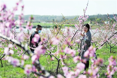 3月13日,嘉鱼县陆溪镇康丰源千亩桃花绽放,吸引游客前往踏青赏花,享受美好春光。