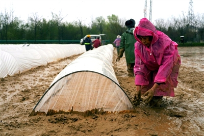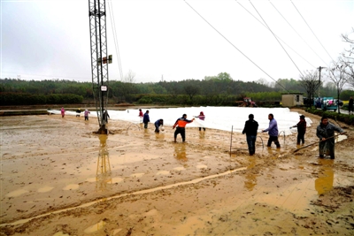 3月22日,位于横沟桥镇群力村5组港边畈的昭阳农机专业合作社早稻集中育秧示范基地里,农民们身披雨衣,脚穿胶鞋,有的手拿提桶,有的手拿水瓢,在整齐排放的秧盘上撒种、插竹条、铺地膜……有条不紊地进行着早稻育秧,现场一派繁忙景象。