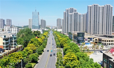 俯看城区银泉大道,两侧绿树成荫、高楼林立,尽显城市魅力。银泉大道是城区主干道之一,也是展示我市城市形象的一张靓丽名片。