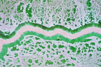近日,在柴达木盆地,茫崖翡翠湖淡青、翠绿、深绿色的湖水如碎玉散落在大漠戈壁上,充满生机。茫崖翡翠湖面积约26平方公里,属于硫酸镁亚型盐湖。