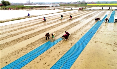 3月28日,咸安区双溪桥镇育秧基地,村民正在开展双季稻集中育秧。