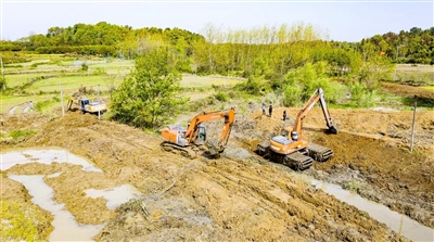 本报讯 通讯员雷平、卜美娟报道:4月9日,嘉鱼县高铁岭镇九龙村李珠港机声隆隆,3台大型挖掘机正忙着清淤。