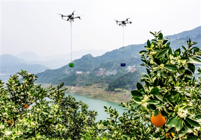 4月11日,秭归县郭家坝镇擂鼓台村村民在田间使用无人机转运刚收获的脐橙。