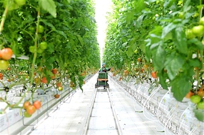 近日,在四川省内江市资中县银山镇现代农业园区,村民在智慧温室大棚内采收番茄。银山镇天府智慧农业生态园种植的4万余株番茄迎来采摘季。
