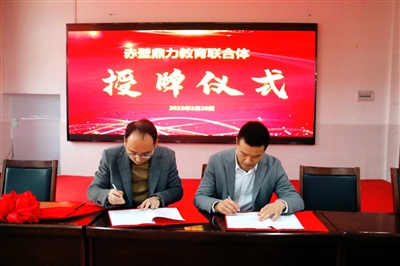 为加快义务教育优质均衡发展,振兴乡村教育优化资源配置,3月28日,赤壁鼎力“教联体”授牌仪式在赤壁市赤壁镇中学举行,这是该市挂牌成立的首个“教联体”。