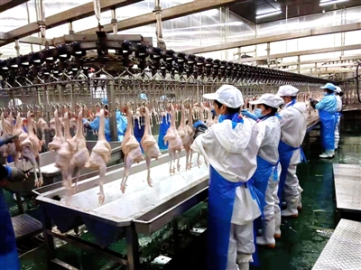 同日,在温氏佳丰食品有限公司,一冷一热两条鸡产品生产线正在高速运转。“冷线”生产成品冰鲜鸡(0-4摄氏度),“热线”生产成品熟食整鸡(白切鸡、卤香鸡、盐焗鸡)。“两条生产线,每年可宰杀肉鸡4500万只、肉鸭1500万只,加工熟食2000万只,配餐食品4500吨,解决就业600人以上。”项目负责人说。