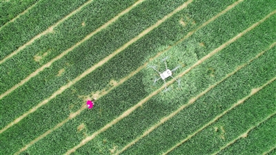 在安徽省蚌埠市怀远县徐圩乡,盛世兴农农机专业合作社理事长尚跃正在田头指挥工人们开展小麦赤霉病防治飞防作业。“今年我有3万亩托管麦田要开展防治,预计两三天就能飞防一遍。”他说。