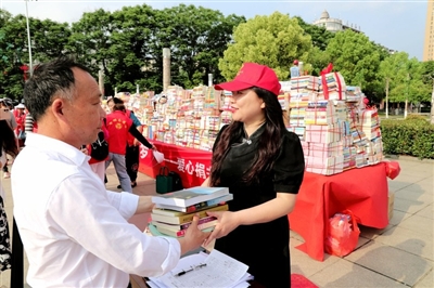 本报讯 记者焦姣、特约记者徐大发报道:“这是我很喜欢的几本书,今天把它捐出来,希望能让更多的人阅读。”4月21日上午,在通山县政府广场,市民许文丽现场捐赠出了自己收藏已久的书籍。工作人员周围,中国古典文学、世界名著、杂志期刊等一摞摞的捐赠书籍被打包整齐,堆成了小山。