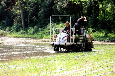 4月20日,在通山县南林桥镇湄溪村的一块水田里,农机手驾驶着插秧机穿梭,青翠的秧苗盘整齐码在插秧机上。机器行过,一株株秧苗从苗盘上次第滑落、插进田中。