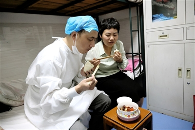 趁着没人就诊的时间,两个人来到医院的休息室就着板凳当桌,沿床而坐,一碗菜、一个馒头两人分着吃,草草对付着迟到的晚餐,温馨的画面照亮了不足四平方米的休息间。